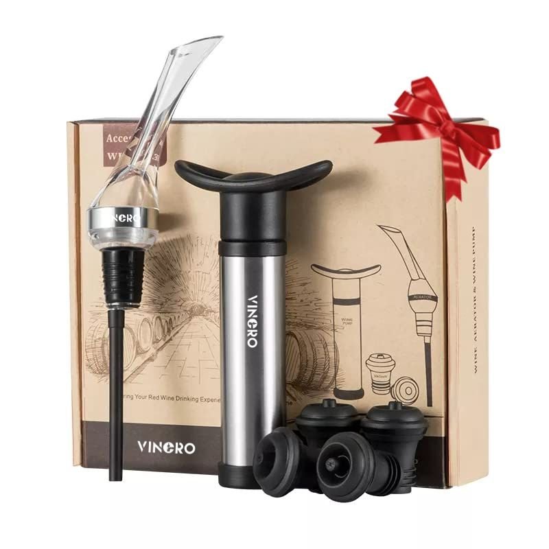 Vacuum Pump, Aerator, and 4 Hermetic Stoppers: Indulge yourself or surprise a wine-loving friend with our exquisite gift set. This thoughtful collection includes a convenient vacuum pump for preserving the freshness of unfinished bottles, a high-quality wine aerator for enhanced flavors, and four hermetic stoppers to seal the aroma and taste securely.